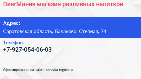 BeerМания, магазин разливных напитков по адресу Саратовская область, Балаково, Степная, 74 в дальнейшем Организация, размещена в следующих категориях: