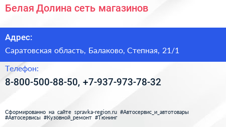 Белая Долина, сеть магазинов по адресу Саратовская область, Балаково, Степная, 21/1 в дальнейшем Организация, размещена в следующих категориях: