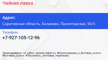 Чайная лавка по адресу Саратовская область, Балаково, Пролетарская, 50/1 в дальнейшем Организация, размещена в следующих категориях: