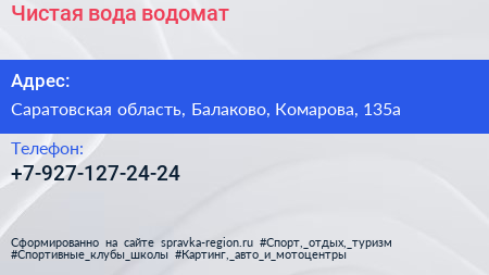 Чистая вода, водомат по адресу Саратовская область, Балаково, Комарова, 135а в дальнейшем Организация, размещена в следующих категориях: