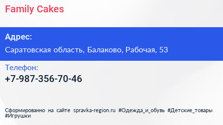 Family Cakes по адресу Саратовская область, Балаково, Рабочая, 53 в дальнейшем Организация, размещена в следующих категориях: