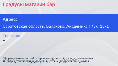 Градусы, магазин-бар по адресу Саратовская область, Балаково, Академика Жук, 13/1 в дальнейшем Организация, размещена в следующих категориях: