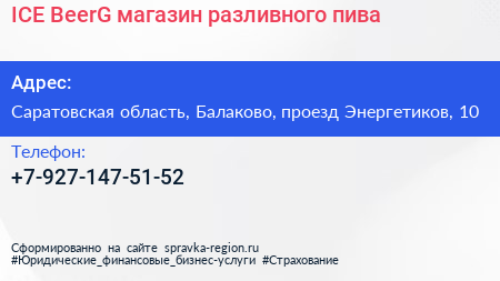 ICE BeerG, магазин разливного пива по адресу Саратовская область, Балаково, проезд Энергетиков, 10 в дальнейшем Организация, размещена в следующих категориях: