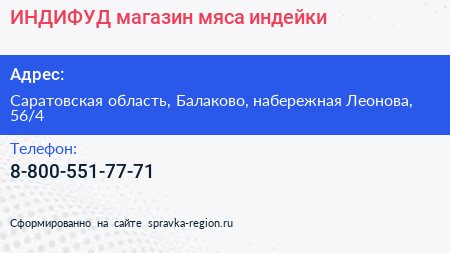 ИНДИФУД, магазин мяса индейки по адресу Саратовская область, Балаково, набережная Леонова, 56/4 в дальнейшем Организация, размещена в следующих категориях: