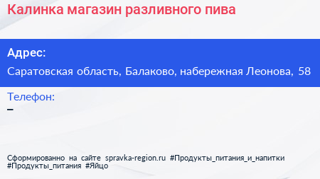 Калинка, магазин разливного пива по адресу Саратовская область, Балаково, набережная Леонова, 58 в дальнейшем Организация, размещена в следующих категориях: