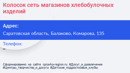 Колосок, сеть магазинов хлебобулочных изделий по адресу Саратовская область, Балаково, Комарова, 135 в дальнейшем Организация, размещена в следующих категориях: