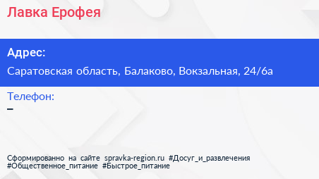 Лавка Ерофея по адресу Саратовская область, Балаково, Вокзальная, 24/6а в дальнейшем Организация, размещена в следующих категориях: