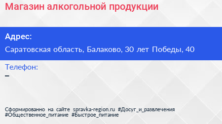 Магазин алкогольной продукции по адресу Саратовская область, Балаково, 30 лет Победы, 40 в дальнейшем Организация, размещена в следующих категориях: