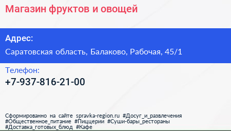 Магазин фруктов и овощей по адресу Саратовская область, Балаково, Рабочая, 45/1 в дальнейшем Организация, размещена в следующих категориях: