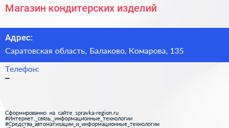 Магазин кондитерских изделий по адресу Саратовская область, Балаково, Комарова, 135 в дальнейшем Организация, размещена в следующих категориях: