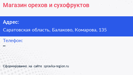 Магазин орехов и сухофруктов по адресу Саратовская область, Балаково, Комарова, 135 в дальнейшем Организация, размещена в следующих категориях: