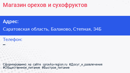 Магазин орехов и сухофруктов по адресу Саратовская область, Балаково, Степная, 34Б в дальнейшем Организация, размещена в следующих категориях: