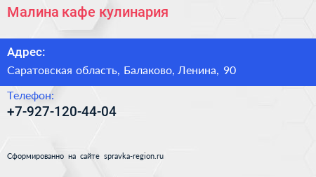 Малина, кафе-кулинария по адресу Саратовская область, Балаково, Ленина, 90 в дальнейшем Организация, размещена в следующих категориях: