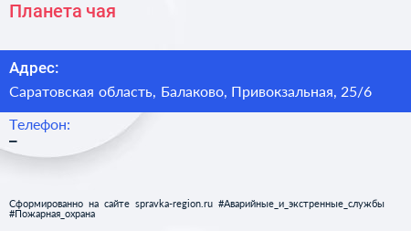 Планета чая по адресу Саратовская область, Балаково, Привокзальная, 25/6 в дальнейшем Организация, размещена в следующих категориях: