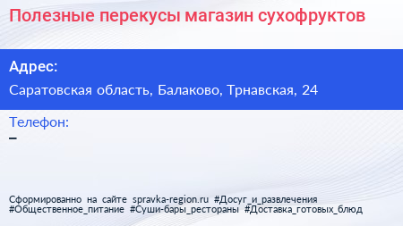 Полезные перекусы, магазин сухофруктов по адресу Саратовская область, Балаково, Трнавская, 24 в дальнейшем Организация, размещена в следующих категориях: