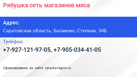 Рябушка, сеть магазинов мяса по адресу Саратовская область, Балаково, Степная, 34Б в дальнейшем Организация, размещена в следующих категориях: