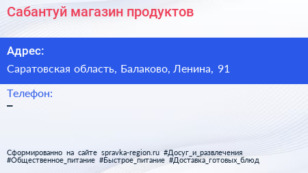 Сабантуй, магазин продуктов по адресу Саратовская область, Балаково, Ленина, 91 в дальнейшем Организация, размещена в следующих категориях: