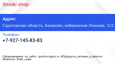 Smoki shop по адресу Саратовская область, Балаково, набережная Леонова, 1/2 в дальнейшем Организация, размещена в следующих категориях: