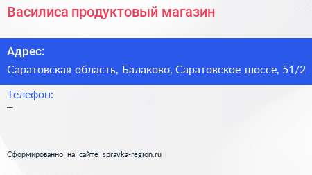 Василиса, продуктовый магазин по адресу Саратовская область, Балаково, Саратовское шоссе, 51/2 в дальнейшем Организация, размещена в следующих категориях: