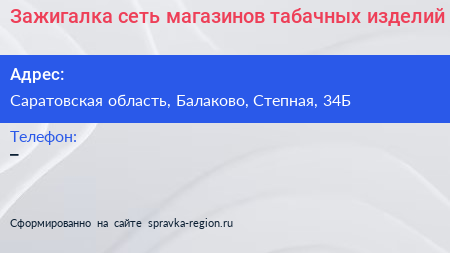 Зажигалка, сеть магазинов табачных изделий по адресу Саратовская область, Балаково, Степная, 34Б в дальнейшем Организация, размещена в следующих категориях: