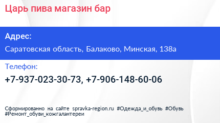 Царь пива, магазин-бар по адресу Саратовская область, Балаково, Минская, 138а в дальнейшем Организация, размещена в следующих категориях: