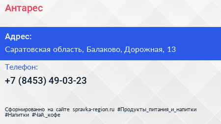 Антарес по адресу Саратовская область, Балаково, Дорожная, 13 в дальнейшем Организация, размещена в следующих категориях: