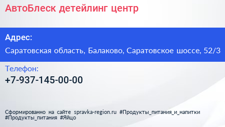 АвтоБлеск, детейлинг-центр по адресу Саратовская область, Балаково, Саратовское шоссе, 52/3 в дальнейшем Организация, размещена в следующих категориях: