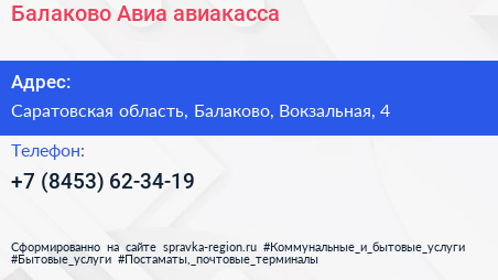 Балаково-Авиа, авиакасса по адресу Саратовская область, Балаково, Вокзальная, 4 в дальнейшем Организация, размещена в следующих категориях: