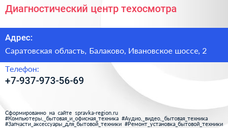 Диагностический центр техосмотра по адресу Саратовская область, Балаково, Ивановское шоссе, 2 в дальнейшем Организация, размещена в следующих категориях:
