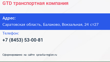 GTD, транспортная компания по адресу Саратовская область, Балаково, Вокзальная, 24 ст27 в дальнейшем Организация, размещена в следующих категориях: