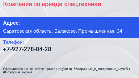 Компания по аренде спецтехники по адресу Саратовская область, Балаково, Промышленная, 34 в дальнейшем Организация, размещена в следующих категориях: