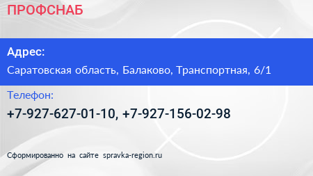 ПРОФСНАБ по адресу Саратовская область, Балаково, Транспортная, 6/1 в дальнейшем Организация, размещена в следующих категориях: