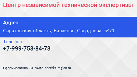 Центр независимой технической экспертизы по адресу Саратовская область, Балаково, Свердлова, 54/1 в дальнейшем Организация, размещена в следующих категориях: