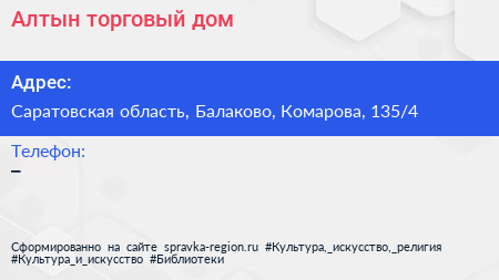 Алтын, торговый дом по адресу Саратовская область, Балаково, Комарова, 135/4 в дальнейшем Организация, размещена в следующих категориях: