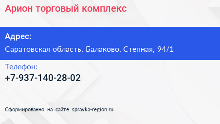Арион, торговый комплекс по адресу Саратовская область, Балаково, Степная, 94/1 в дальнейшем Организация, размещена в следующих категориях: