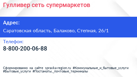 Гулливер, сеть супермаркетов по адресу Саратовская область, Балаково, Степная, 26/1 в дальнейшем Организация, размещена в следующих категориях:
