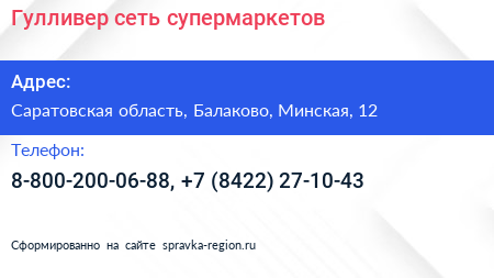 Гулливер, сеть супермаркетов по адресу Саратовская область, Балаково, Минская, 12 в дальнейшем Организация, размещена в следующих категориях: