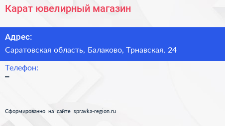 Карат, ювелирный магазин по адресу Саратовская область, Балаково, Трнавская, 24 в дальнейшем Организация, размещена в следующих категориях: