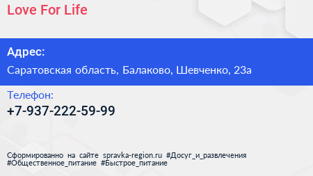Love For Life по адресу Саратовская область, Балаково, Шевченко, 23а в дальнейшем Организация, размещена в следующих категориях:
