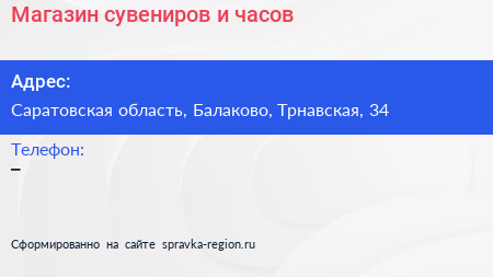 Магазин сувениров и часов по адресу Саратовская область, Балаково, Трнавская, 34 в дальнейшем Организация, размещена в следующих категориях: