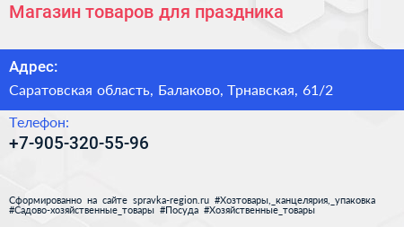 Магазин товаров для праздника по адресу Саратовская область, Балаково, Трнавская, 61/2 в дальнейшем Организация, размещена в следующих категориях: