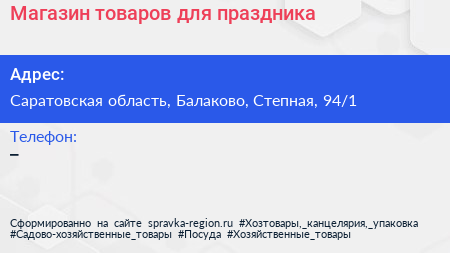 Магазин товаров для праздника по адресу Саратовская область, Балаково, Степная, 94/1 в дальнейшем Организация, размещена в следующих категориях: