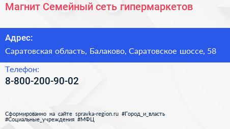 Магнит Семейный, сеть гипермаркетов по адресу Саратовская область, Балаково, Саратовское шоссе, 58 в дальнейшем Организация, размещена в следующих категориях: