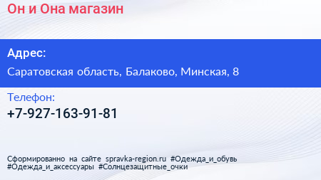 Он и Она, магазин по адресу Саратовская область, Балаково, Минская, 8 в дальнейшем Организация, размещена в следующих категориях: