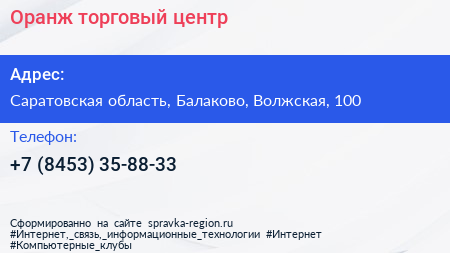 Оранж, торговый центр по адресу Саратовская область, Балаково, Волжская, 100 в дальнейшем Организация, размещена в следующих категориях: