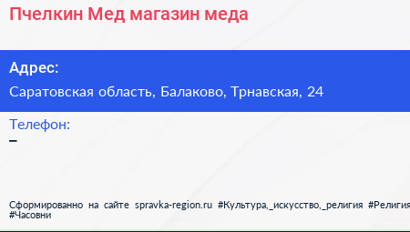 Пчелкин Мед, магазин меда по адресу Саратовская область, Балаково, Трнавская, 24 в дальнейшем Организация, размещена в следующих категориях: