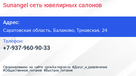 Sunangel, сеть ювелирных салонов по адресу Саратовская область, Балаково, Трнавская, 24 в дальнейшем Организация, размещена в следующих категориях: