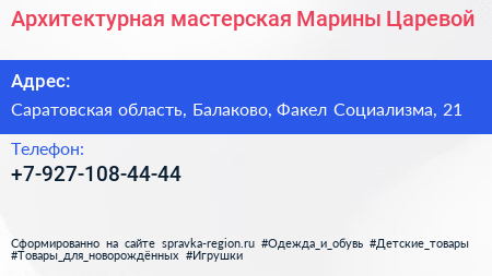 Архитектурная мастерская Марины Царевой по адресу Саратовская область, Балаково, Факел Социализма, 21 в дальнейшем Организация, размещена в следующих категориях: