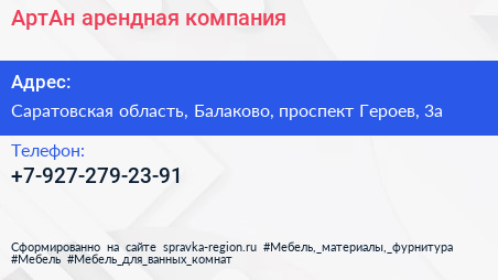 АртАн, арендная компания по адресу Саратовская область, Балаково, проспект Героев, 3а в дальнейшем Организация, размещена в следующих категориях: