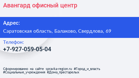 Авангард, офисный центр по адресу Саратовская область, Балаково, Свердлова, 69 в дальнейшем Организация, размещена в следующих категориях: